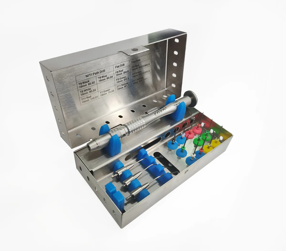 - دارای 5 فایل Path Drill ، و 3 تیپ Cutting Drill و 3 تیپ Trephine ضد زنگ و ضد فرسودگی